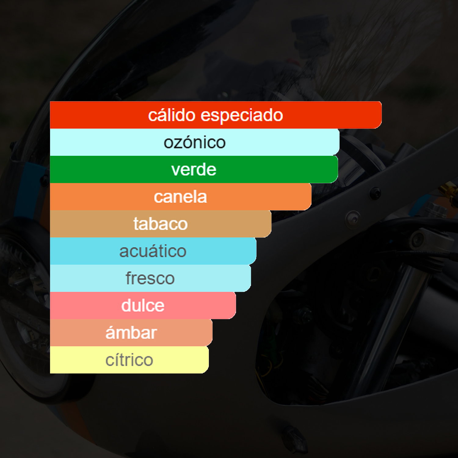 Características olfativas: es cálido especiado, ozónico, verde, canela, tabaco, acuático, fresco