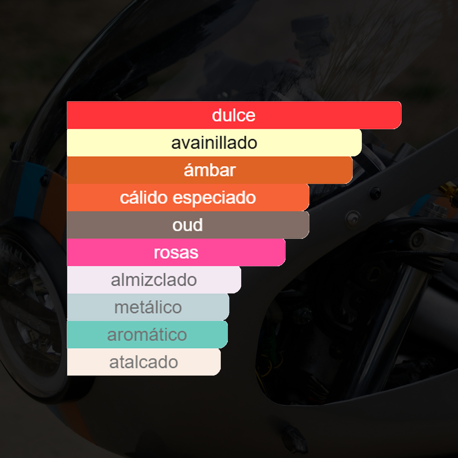 Características olfativas: es dulce, avainillado, ámbar ,oud, cálido especiado, rosas,